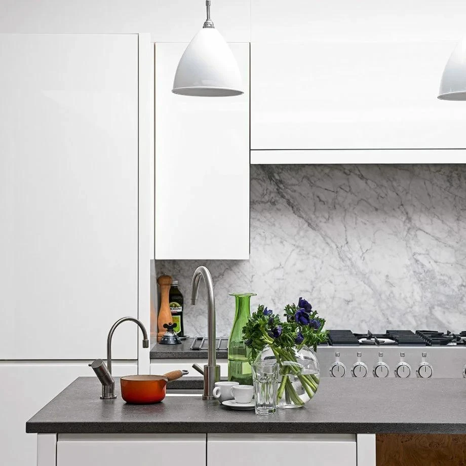 Чтобы ваша белая кухня не выглядела слишком первозданной и отполированной, добавьте элементы винтажного дизайна. Освещение в индустриальном стиле и потрескавшаяся керамика помогут привнести нотку неподвластного времени винтажного стиля в современную отделку. Элементы по-прежнему белые, чтобы сохранить целостный вид, но благодаря ощущению наследия, присущему таким предметам, пространство сохраняет атмосферу эклектики.