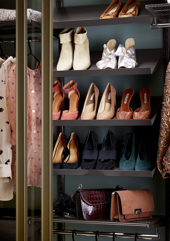 Учтите, что полки должны быть достаточно широкими, чтобы разместить коробки с обувью, а стеллажи - достаточно высокими, чтобы на них можно было повесить длинную одежду.
