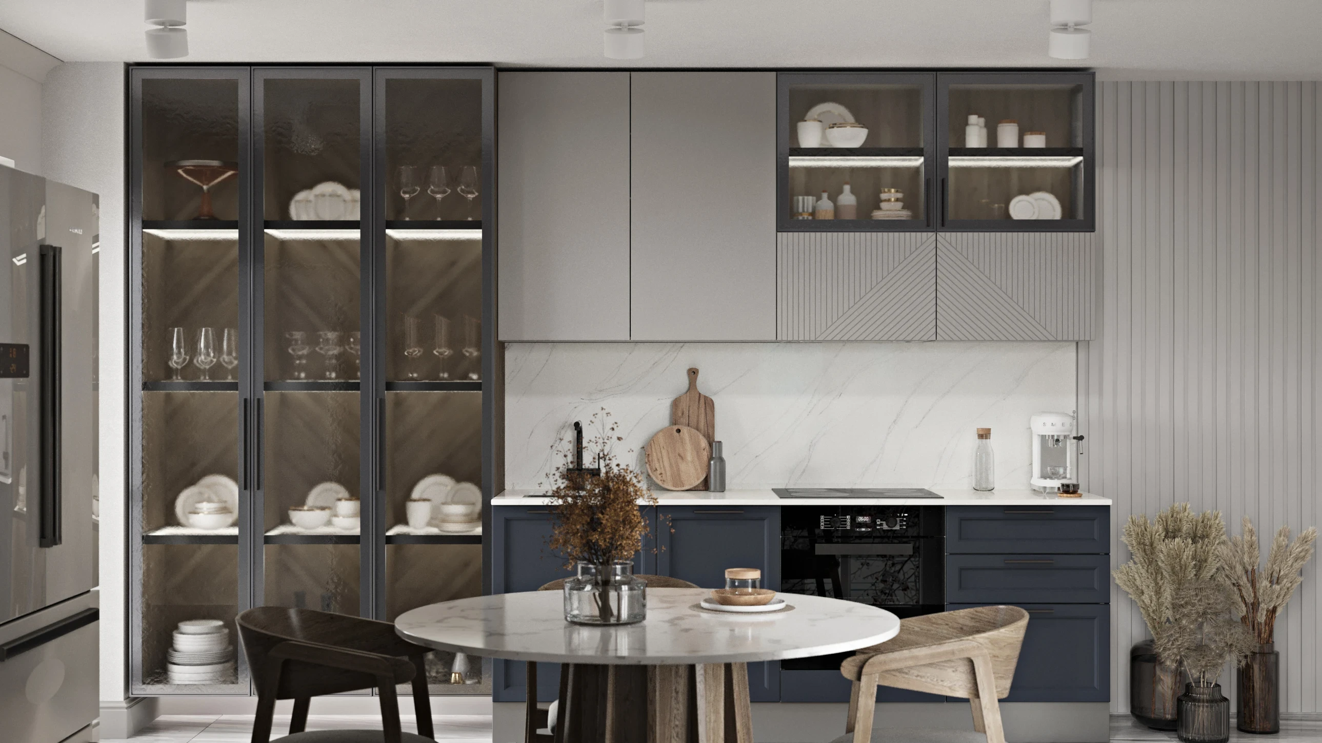 Кухня выглядит цельной и аккуратной. Особенно хорошо работает в интерьерах с современным или строгим стилем — фасады образуют единую вертикаль, без “обрыва” по верхней линии.