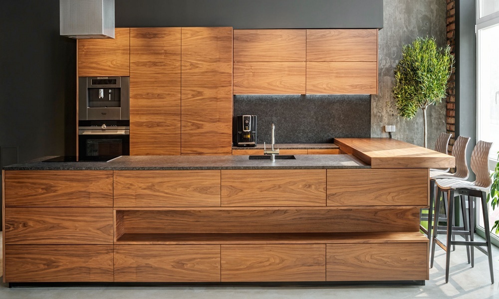 Комбинирование материалов. Шпон хорошо сочетается с другими материалами, такими как стекло, металл или камень. Это позволяет создавать уникальные композиции и подчеркивать разные зоны на кухне.
