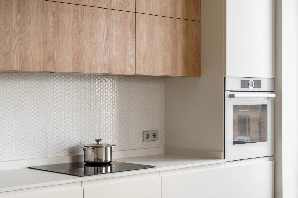 Ещё одно современное решение — использование фартука в качестве бортика для столешницы. Изготовленный из того же материала, что и столешница, фартук обеспечивает бесшовный переход и не требует дополнительной герметизации. Это стильное и практичное решение, которое придаёт кухне законченный и элегантный вид.