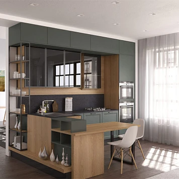 Наши дизайнеры позаботились о том, чтобы ваше пребывание на кухне было комфортным и приятным. Множество открытых полочек, рейлинги и прочие приспособления позволят хозяйке хранить наиболее часто используемую кухонную утварь в легкодоступных местах. Пространство используется рационально, даже верхняя часть шкафчиков пригодна для хранения кастрюль и прочей посуды.
