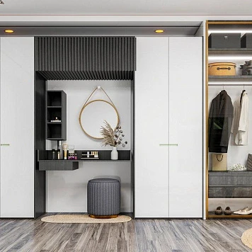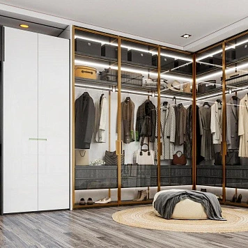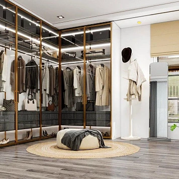 Гардеробная Концепт — это гармония современного дизайна, комфорта и продуманной организации. Пространство оформлено в светлых тонах с акцентом на прозрачность и структуру: стеклянные фасады с золотистой рамой придают лёгкость и благородство, а мягкое освещение создаёт атмосферу уюта и уединения.