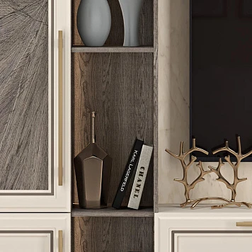 Модель отличается зонами для хранения. Здесь есть шкафы-пеналы, выдвижные ящики, содержимое которых закрыто от просмотра. Это позволяет комфортно разместить личные вещи, спрятать их от посторонних глаз. Есть открытые деревянные полки для любимых книг, фоторамок, элементов декора. Они как бы обрамляют зону для телевизора, где, кстати, можно разместить модель любой диагонали. Механизм открывания у элементов очень простой, при необходимости есть возможность самостоятельно выбрать фурнитуру.