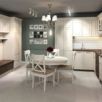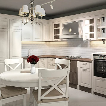 Кухня выполнена в светлых тонах с фасадами классической формы. Для верхних шкафов мы использовали глухие фасады и витрины с декоративными рамками, а нижние дополнили дверцами с горизонтальными планками. Рабочая поверхность подчеркнута контрастной столешницей, а встроенная техника органично вписана в общий ансамбль.