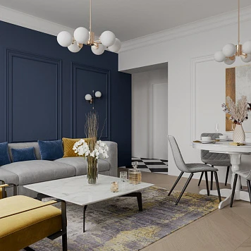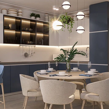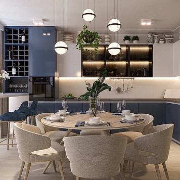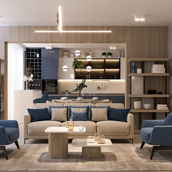 Основой композиции стали встроенные системы хранения и декоративные стеллажи, выполненные в сочетании теплых древесных текстур и глубокого синего оттенка. Такое решение позволило создать выразительный акцент и одновременно сохранить целостность интерьера.