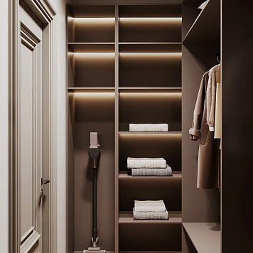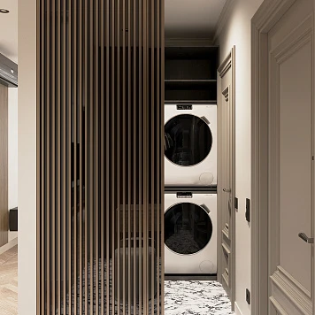 Нашей задачей было создать мебель для квартиры в единой стилистике — кухня, гардеробная, гостиная, ванная комната, рабочее место и прачечная должны были гармонично сочетаться между собой. Важно было объединить все зоны в одну коллекцию, сохранив эстетику современного интерьера и удобство в использовании.