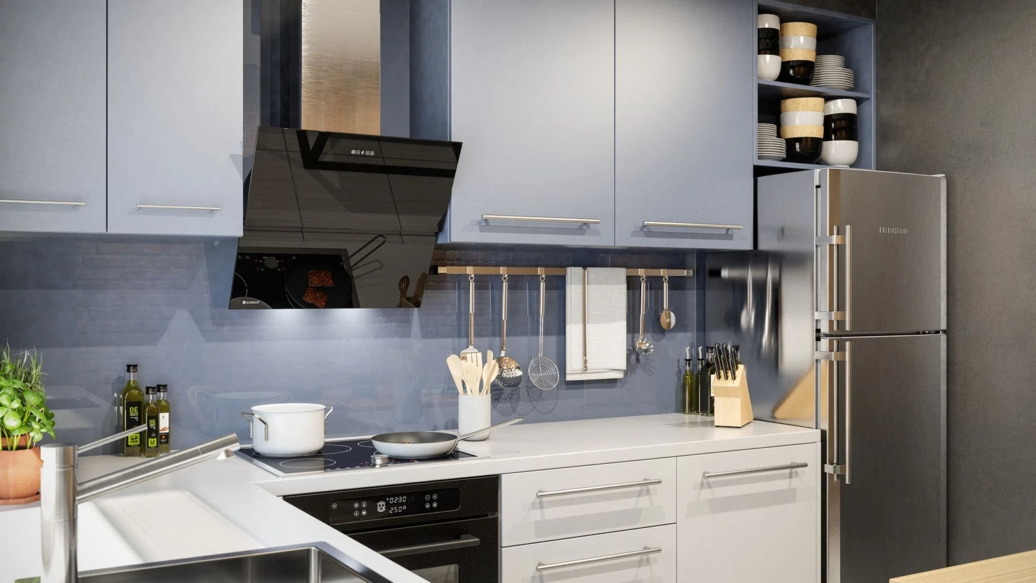 Настенные вытяжки крепятся на стену над плитой. Эти вытяжки полностью видны, поэтому при их выборе важно учитывать дизайн, чтобы он гармонировал с интерьером кухни. Самые распространенные дизайны настенных вытяжек — купольные и наклонные. Купольные вытяжки напоминают камин с дымоходом и требуют подключения к воздуховоду. Наклонные вытяжки популярны в современных интерьерах благодаря разнообразию оттенков и материалов, компактности и низкому уровню шума.