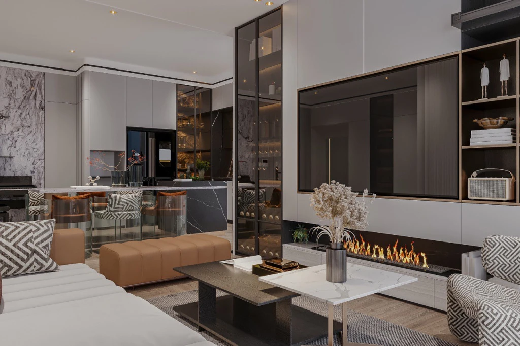 - Барная витрина с подсветкой — именно тот акцент, которого не хватало вашей гостиной.