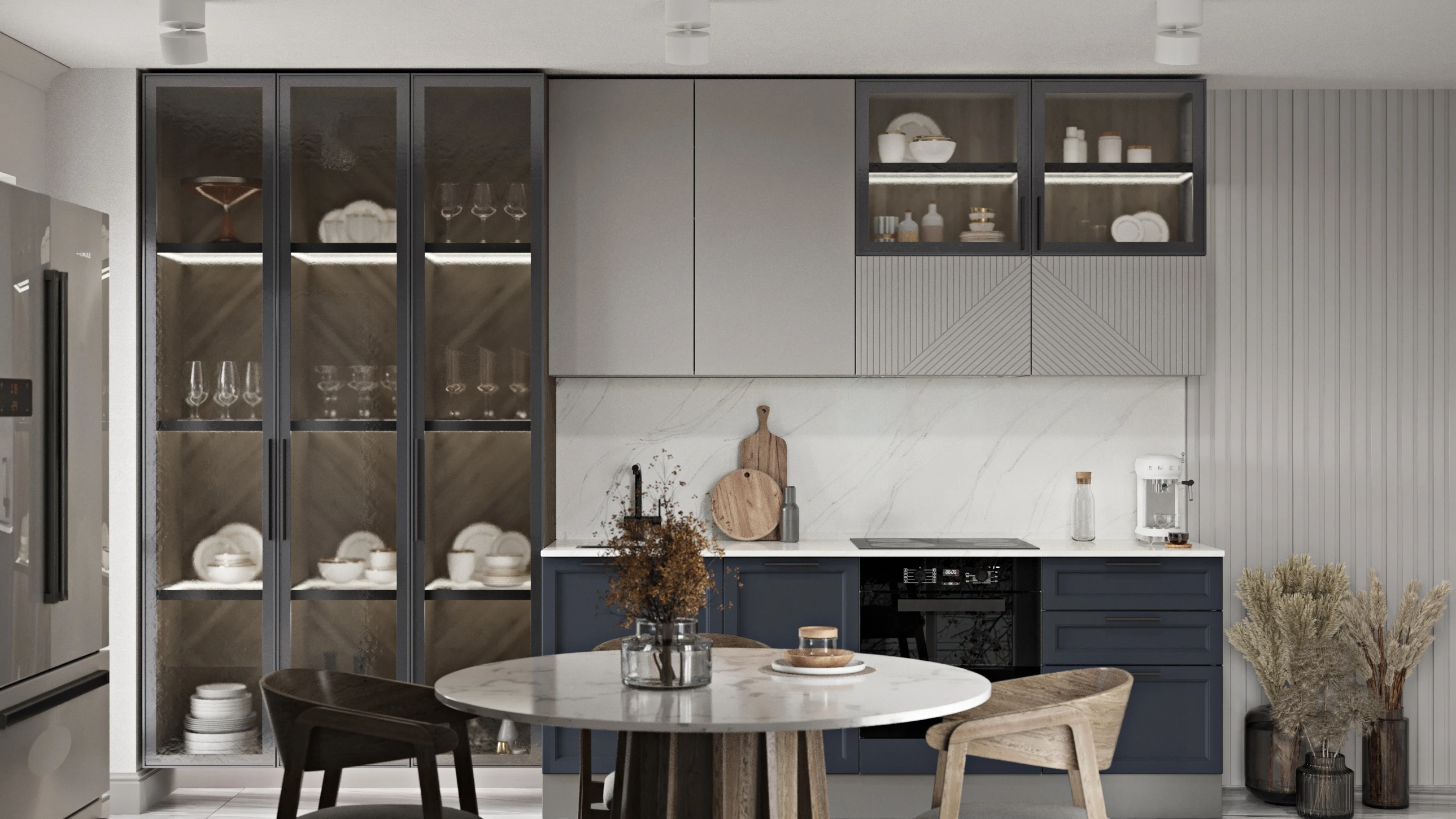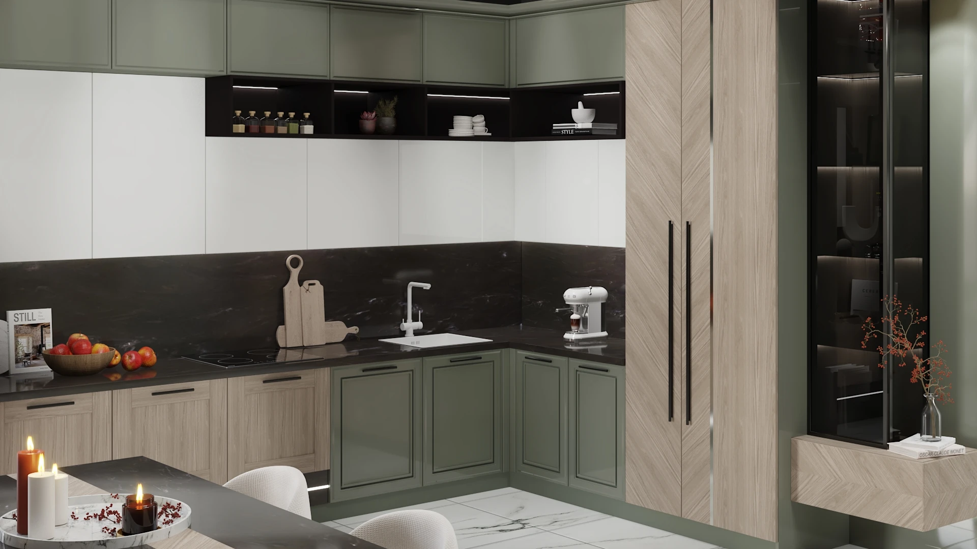 Эмалированные фасады легко комбинируются с другими материалами: столешницами из камня, стеновыми панелями, фурнитурой разных оттенков. Это даёт больше свободы в дизайне и позволяет делать кухни без привязки к одному стилю.