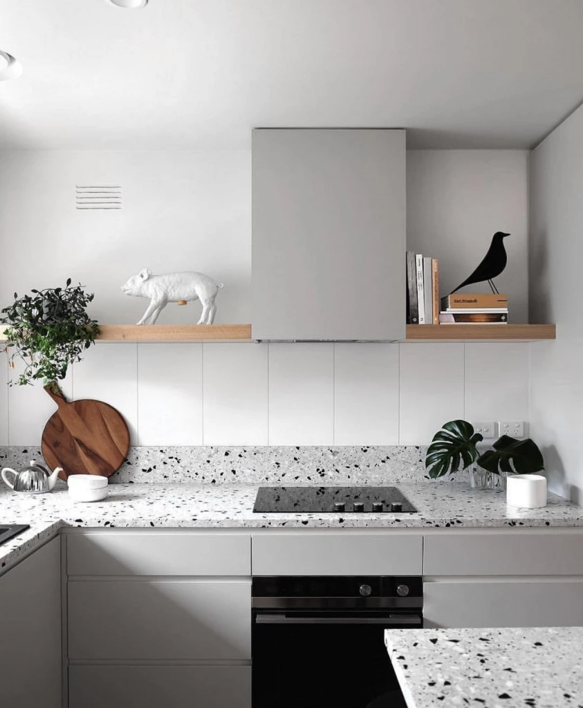 2. Мозаика "Terrazzo": Этот классический материал переживает свое возрождение благодаря современным технологиям и переработке материалов. Столешницы из терраццо в уникальных цветовых комбинациях добавляют в кухню игривость и индивидуальный шарм, при этом подчеркивая ее экологическую составляющую.