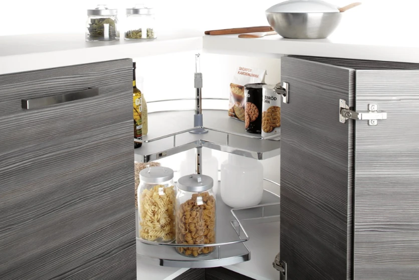 Еще один способ максимально эффективно использовать угловое пространство. Она представляет собой специальную стойку с полками, которая может вращаться на 360 градусов в любую сторону. Может использоваться как для нижних, так и для верхних шкафов.