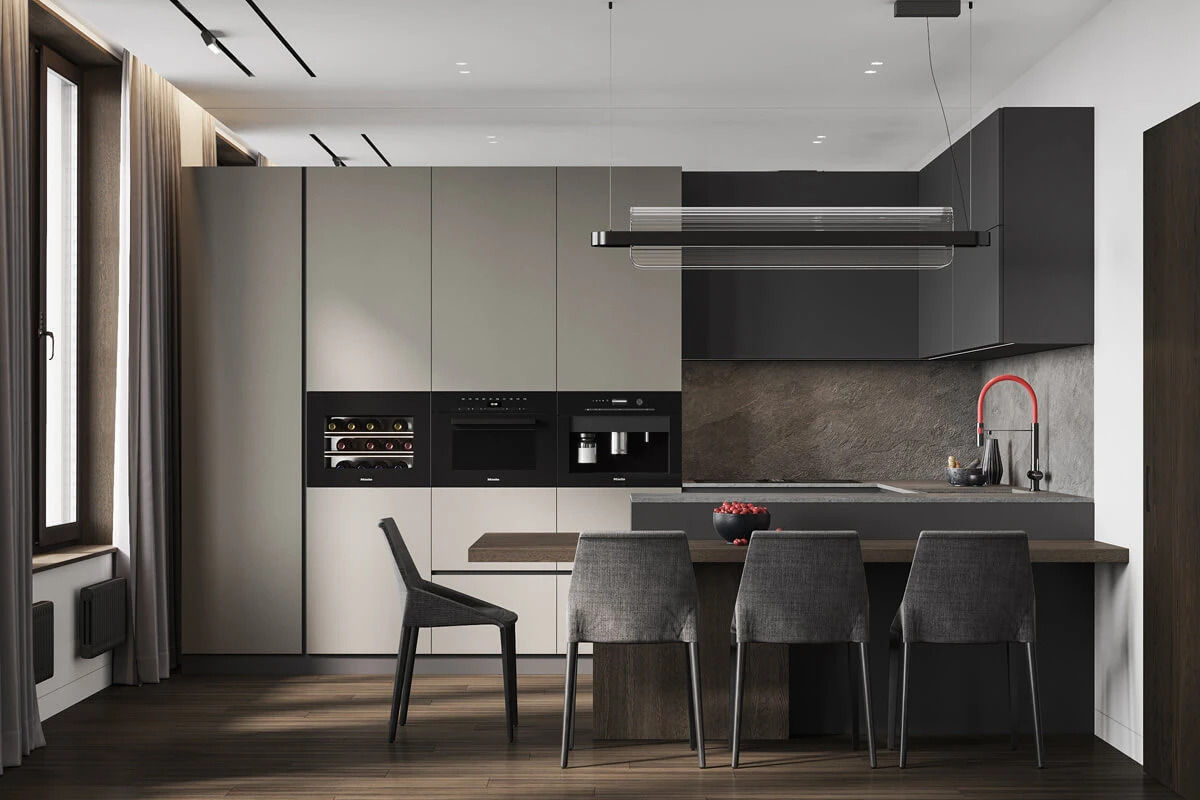 Такая техника сейчас пользуется огромной популярностью у многих семей. Она устанавливается в специальные ниши, а некоторые устройства «прячутся» в шкафы, создавая равномерный и гармоничный вид кухни. Встраиваемая техника также экономит место и может быть идеальным решением для небольших кухонь, так как все элементы скрыты за фасадами, что придает аккуратный и минималистический вид пространству. Расположение приборов организовано так, чтобы все было легкодоступно и занимало минимум пространства в ширину, потому что есть возможность ставить технику друг на друга.