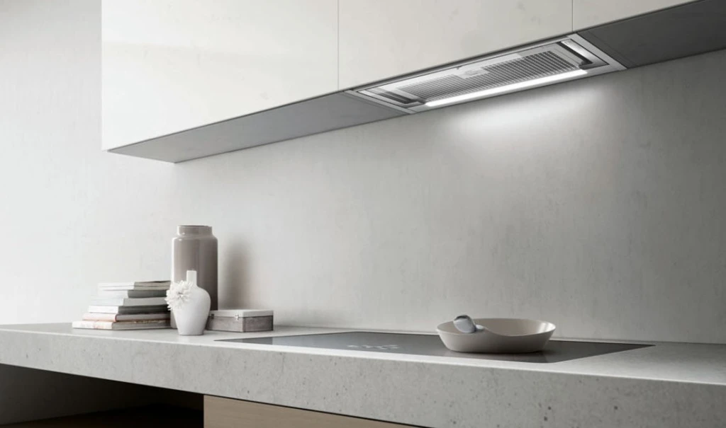 5. Вытяжка. Встраивается в верхние шкафы, что делает ее менее заметной.