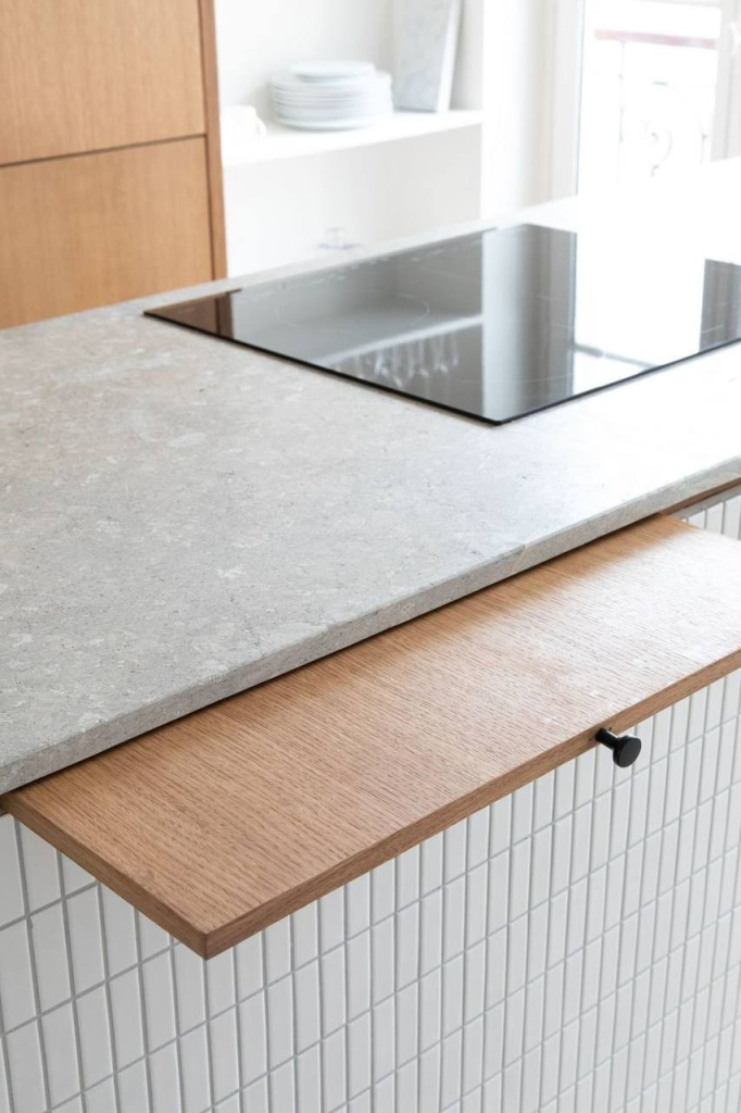 Выдвижная столешница — это дополнительная поверхность, которая может быть спрятана, когда она не используется, и легко выдвигаться, когда требуется больше места для приготовления пищи или сервировки стола. Эти столешницы могут быть встроены в кухонные шкафы или тумбы, обеспечивая дополнительное пространство без необходимости в больших изменениях в дизайне.
