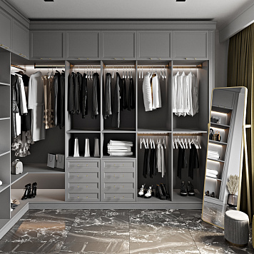 Пространство организовано максимально функционально: множество полок для хранения аксессуаров, ящики для белья и мелких предметов, штанги для одежды разной длины. Встроенная подсветка акцентирует внимание на вещах, создавая атмосферу уюта.