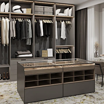 Главный акцент — просторный центральный остров с прозрачной стеклянной столешницей и аккуратными секциями для аксессуаров. Такая организация не только практична, но и визуально облегчает пространство, добавляя ему утончённости.