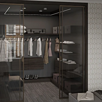 Гардеробная Гала Алвик — воплощение современного стиля и функциональности. Тёплые древесные оттенки в сочетании с тонированными стеклянными фасадами создают атмосферу уюта и сдержанной роскоши. Компактная, но продуманная организация внутреннего пространства позволяет разместить всё необходимое: от верхней одежды до обуви и аксессуаров.