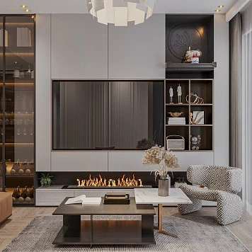 Мишель объединяет закрытые системы хранения и открытые ниши для декора. Центральная часть оформлена под телевизор с декоративным камином внизу, а сбоку встроен шкаф-витрина со стеклянными фасадами в алюминиевой рамке и мягкой внутренней подсветкой — для размещения бокалов и бутылок.