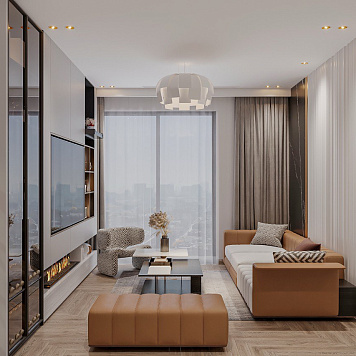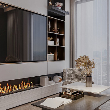 Мишель объединяет закрытые системы хранения и открытые ниши для декора. Центральная часть оформлена под телевизор с декоративным камином внизу, а сбоку встроен шкаф-витрина со стеклянными фасадами в алюминиевой рамке и мягкой внутренней подсветкой — для размещения бокалов и бутылок.