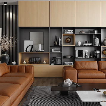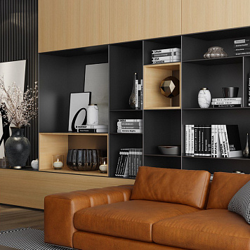 Центральным элементом композиции выступает модульная стенка с открытыми и закрытыми секциями. Чередование ниш и полок разной глубины придаёт пространству динамику, а открытые элементы позволяют разместить книги, декор и личные детали, делая интерьер живым.