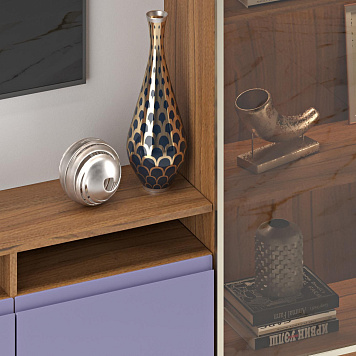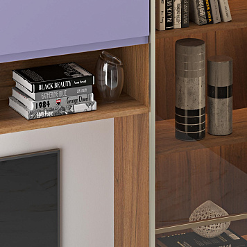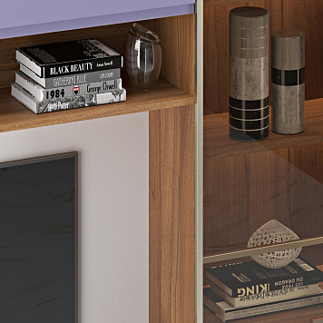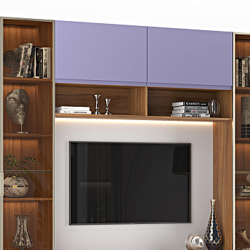 ТВ-стенка Мишель АЛ рамка — отличное решение для гостиной. Она сочетает в себе зону для телевизора, размер которой можно выбрать самостоятельно, несколько застекленных секций для хранения, закрытые шкафчики и полки. За стеклом вы можете хранить любимые бокалы, сервиз, вазы и другие элементы декора. На обычных полках есть место для книг, журналов и даже цветов. В закрытых вместительных шкафах с удобным механизмом открывания можно разместить личные вещи или предметы, которые должны быть под рукой. Множество полок для сервизов и бокалов делает стенку подходящей для кухни-гостиной. К примеру, если к вам пришли друзья, то можно с легкостью достать необходимые бокалы. Фурнитуру для дверц шкафчиков можно выбрать самостоятельно из позиций нашего каталога.