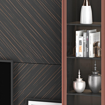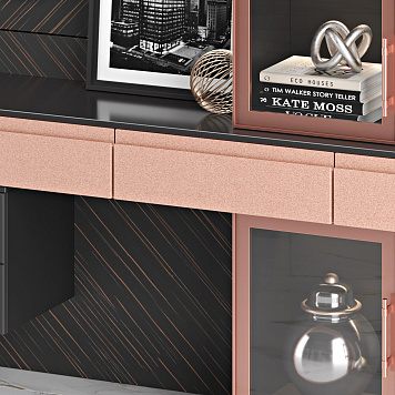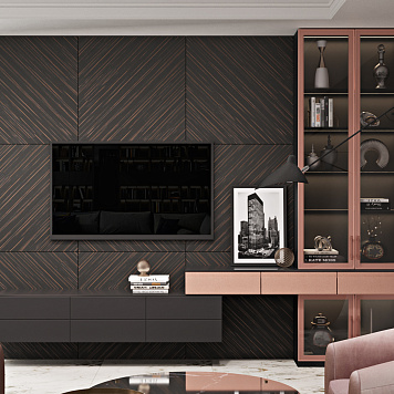 ТВ-стенка Эбони Мишель дополнит вашу гостиную в минималистичном дизайне. Эта модель стильная и выглядит как единое целое. Заднюю панель можно сделать во всю стену вашей гостиной, так вы немного сэкономите на ремонте и вся картина будет выглядеть так, будто телевизор просто висит на стене. Телевизор, кстати, сюда можно подобрать абсолютно любой диагонали. Здесь не много зон для хранения — два двустворчатых шкафа со стеклянными дверцами. На полках вы сможете разместить любимые книги, посуду, фоторамки и другие элементы декора. Фурнитуру для шкафов вы также можете выбрать самостоятельно. Несколько выдвижных горизонтальных ящиков как бы парят над полом, придавая мебели таинственности и невесомости. Кстати, парящие шкафы считаются трендовым решением. Линии на задней панели также задают тренд — геометрию, которая делает интерьер сильнее и притягательнее.