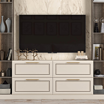 Модель отличается зонами для хранения. Здесь есть шкафы-пеналы, выдвижные ящики, содержимое которых закрыто от просмотра. Это позволяет комфортно разместить личные вещи, спрятать их от посторонних глаз. Есть открытые деревянные полки для любимых книг, фоторамок, элементов декора. Они как бы обрамляют зону для телевизора, где, кстати, можно разместить модель любой диагонали. Механизм открывания у элементов очень простой, при необходимости есть возможность самостоятельно выбрать фурнитуру.