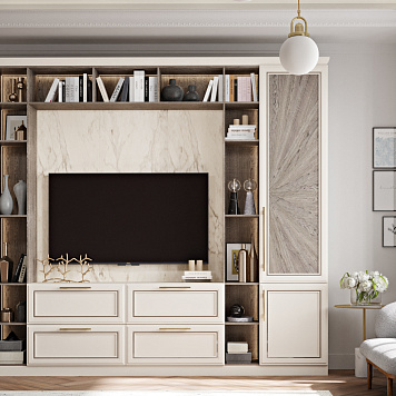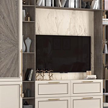 ТВ-стенка Йорк украсит вашу гостиную. Добавит уюта комнате сочетание дерева и имитации мрамора. Дерево олицетворяет силу, тепло, благородство. В гармонии с многогранным камнем помещение станет притягательнее.