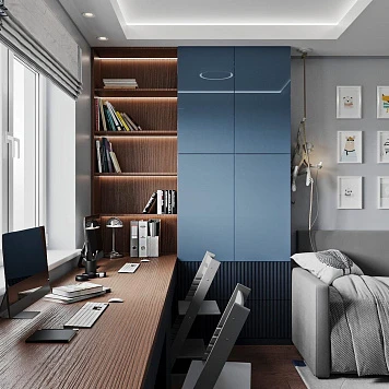 "Квадрика" — это комната, которая сочетает в себе функциональность и стильный дизайн. Простые, но выразительные линии фасадов создают атмосферу порядка и ясности. Эта комната станет идеальным решением для подростка, который нуждается в пространстве для учебы, отдыха и общения, где каждая деталь на своем месте.