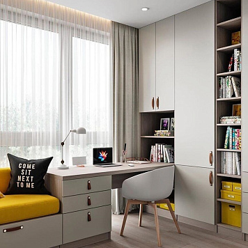 Комната "Мишель" идеально вписывается в стиль лофт, скандинавский и модерн. Лаконичные фасады из ПВХ или эмали придают пространству свежесть и современность. Вариативность врезных ручек позволяет настроить дизайн в зависимости от предпочтений подростка, создавая уютную атмосферу для учебы, отдыха и творчества.