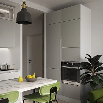 Кухня оформлена в сочетании светло-серых фасадов с мраморной столешницей и фартуком. Верхние шкафы доходят до потолка, обеспечивая максимум места для хранения. Центральный остров визуально разделяет кухню и гостиную, создавая удобную зону для приёма пищи или лёгких перекусов.