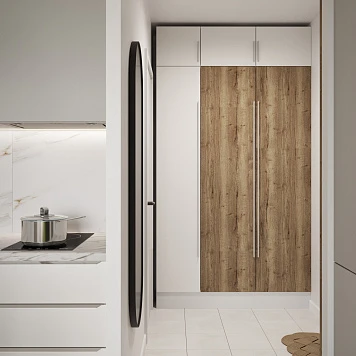 Прихожая поддерживает общий стиль коллекции: фасады из светлого дерева и нейтральные цвета делают её визуально просторнее. Шкафы и открытые секции позволяют хранить всё необходимое аккуратно и удобно.