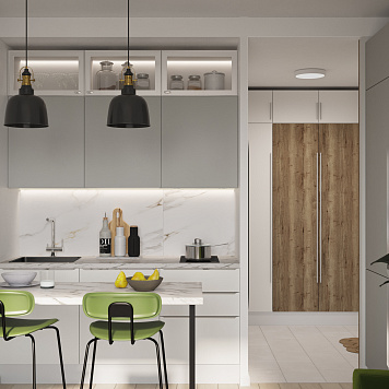 Кухня оформлена в сочетании светло-серых фасадов с мраморной столешницей и фартуком. Верхние шкафы доходят до потолка, обеспечивая максимум места для хранения. Центральный остров визуально разделяет кухню и гостиную, создавая удобную зону для приёма пищи или лёгких перекусов.