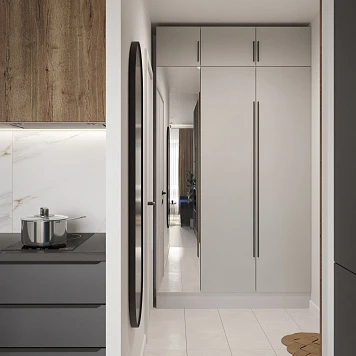 Кухня оформлена в сочетании матовых нижних фасадов черного цвета и верхних фасадов под дерево, создавая стильный контраст и уютную атмосферу. В гостиной предусмотрена тумба под телевизор, выполненная в том же оттенке и текстуре, что и верхние фасады кухни, и дополненная навесными шкафами цвета, совпадающего с нижними фасадами. В прихожей, расположенной за кухней, установлен вместительный шкаф в едином стиле коллекции. Зонирование кухни и гостиной выполнено с помощью острова.