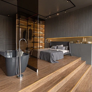 Гардеробная, спальня и прихожая выполнены в том же ритме — всё подчинено идее функциональности, но при этом сохраняется ощущение целостности и визуального единства.