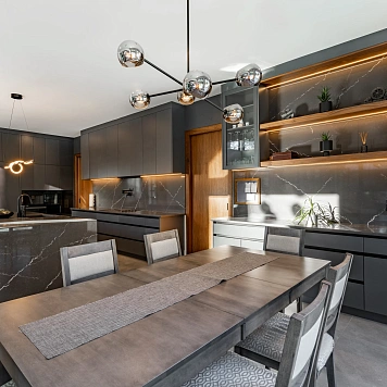 Эта коллекция объединяет кухню и кабинет, создавая цельное интерьерное решение в едином стиле. На кухне акцент сделан на темные фасады с выразительной текстурой, дополненные островом с отделкой под дерево и каменной столешницей. Подсветка и витрины со стеклянными фасадами подчеркивают современную эстетику пространства.