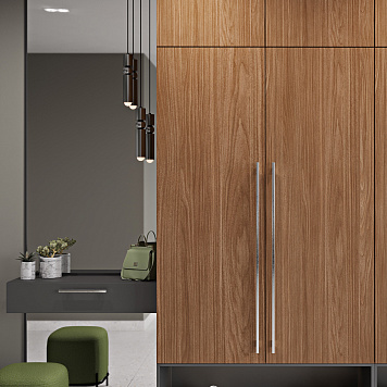 В ней сочетается все, что нужно: большое зеркало в пол , открытая полка для обуви, вместительные шкафы для одежды и туалетный столик.