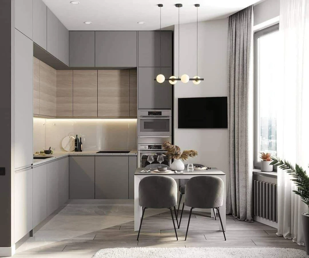 Этот вид освещения придаст уникальности кухне и может визуально увеличить ее размеры. Можно установить подсветку на нижней части кухонного гарнитура, которая создаст эффект парения шкафов.