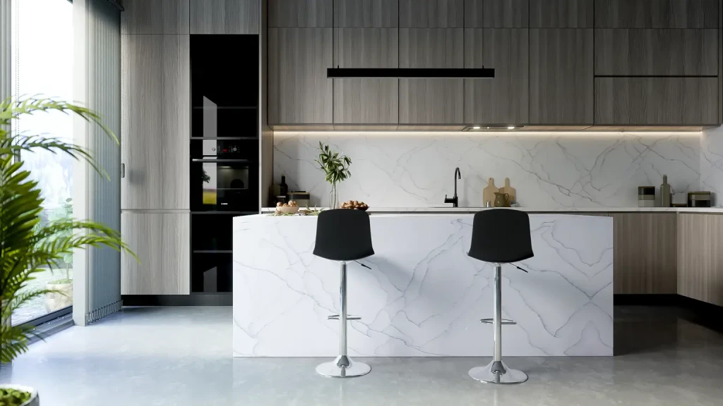 Материал легко поддаётся обработке, что позволяет создавать столешницы с любыми закруглениями, нишами и интегрированными мойками. Благодаря этому дизайн становится целостным и аккуратным, без лишних визуальных переходов.