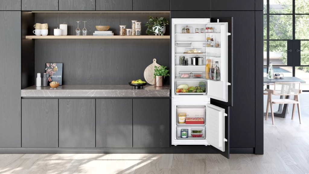 3. Холодильник. Встраиваемые холодильники интегрируются в шкафы, которые спрячут его за своими фасадами, придавая ему гармоничный облик.