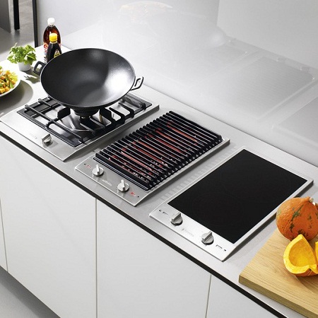2. Варочная поверхность. Как и духовка, очень часто встречается встроенной. Ее можно установить в рабочую поверхность или кухонный остров. Кроме того, можно использовать не одну большую, а несколько небольших варочных панелей, которые подойдут для различных задач. Так, например, можно установить гриль, индукционную панель и конфорку-вок.