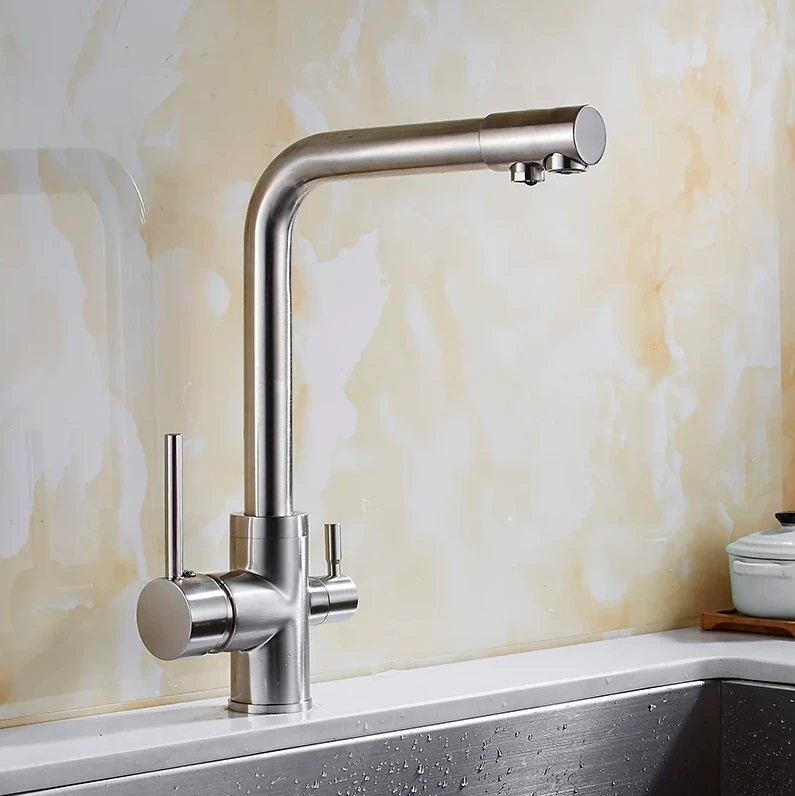 3. Фильтрация воды. Смесители, оснащенные встроенной системой фильтрации воды, улучшают ее качество, удаляя хлор, механические примеси и другие загрязнения. Такой смеситель имеет два излива: для обычной воды и для питьевой.