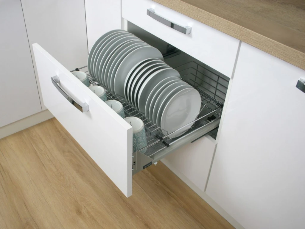 Устанавливаются в нижний ящик кухонного гарнитура и выдвигаются по горизонтали. Эти одноуровневые конструкции могут иметь специальные отсеки для разных видов посуды. Современные направляющие обеспечивают полное выдвижение. Такие сушилки удобны для людей маленького роста и лиц с ограниченной подвижностью.